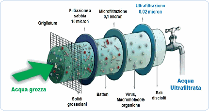 La microfiltrazione è un processo meccanico di trattenimento di tutte le particelle con un diametro superiore a 0,3 micron. Il sistema filtrante non elimina i sali minerali come ad esempio potassio, sodio e calcio che sono fondamentali per l’organismo umano. Inoltre il processo di microfiltrazione elimina odori e sapori dell’acqua che risulta molto più gradevole da bere.